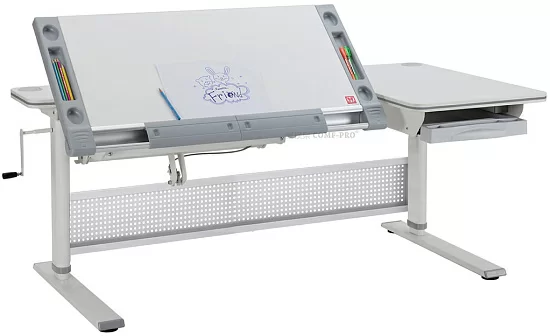 Компактный ящик с органайзером, который расположен под фиксированной частью столешницы, дает возможность хранить школьные предметы и мелкие канцтовары.