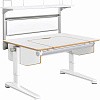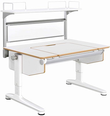 Монтажная доска с книжной полкой Coobee. Светлая доска предназначена для магнитов и рисования на ней смываемыми фломастерами. Вверху находится книжная полка. Монтажная доска легко фиксируется с помощью двух держателей к столу.