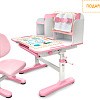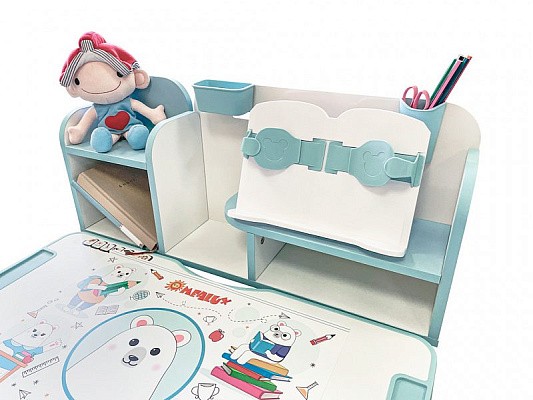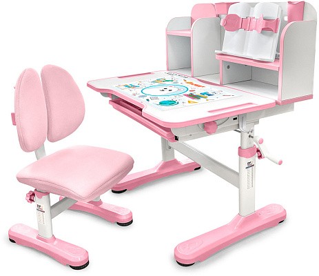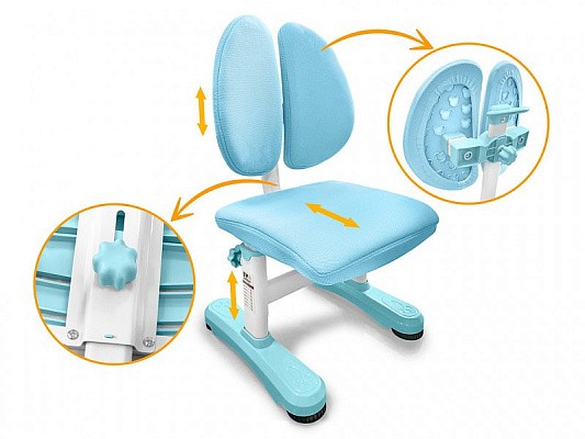 Главной особенностью комплекта является растущее кресло с двойной ортопедической спинкой и мягким съемным сиденьем, обтянутым мебельной дышащей тканью. Кресло регулируется по высоте и глубине специальными винтами. Максимальная нагрузка - 60 кг. На каркасе крепится ручка для удобного перемещения кресла по комнате.