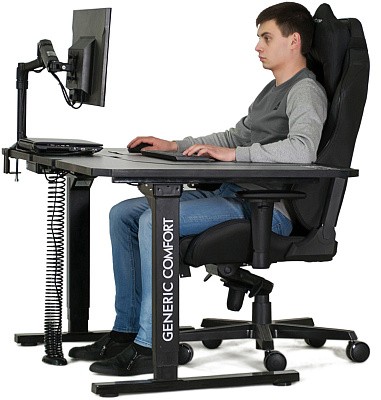 Generic Comfort Uno - эргономичный стол, позволяющий менять положения пользователя в процессе работы. Теперь работать за компьютером Вы сможете сидя, полулежа и даже стоя или на ходу, например занимаясь на дорожке. Стол регулируется по высоте электроприводом, позволяя подстроиться под Ваш рост быстро и бесшумно. Регулируемая по углу наклона столешница обеспечит комфорт рукам и предплечьям при работе в положении полулежа. Фиксация мышки на наклонном сегменте осуществляется благодаря специальному полимагнитному коврику, по которому в обычном положении мышка легко скользит, а при повороте на 90 градусов - надежно фиксируется. В комплекте со столом идет лоток для сетевого фильтра. Также в нашем интернет-магазине вы можете приобрести к столу кронштейн для монитора и вертикальный кабель-канал.