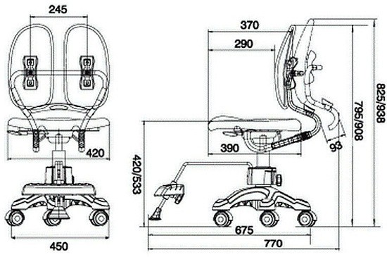 Эргономичное кресло, для поддержания правильной осанки. Эргономичная двухлепестковая спинка, на специальном креплении, создает условие для того, чтобы сесть криво или "боком" ребенку было неудобно. Спинка работает как корректор осанки. Не создает давления на позвоночный столб. Подходит для детей ростом от 95 см до 170 см.