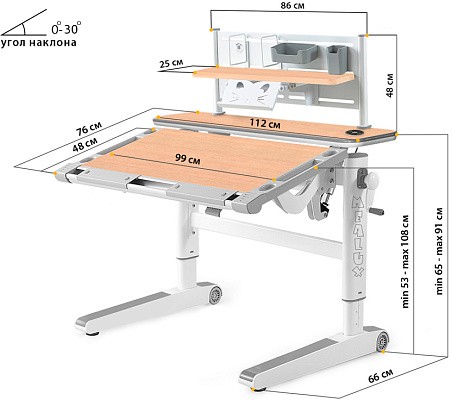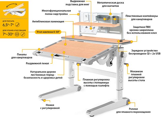 Рабочая поверхность стола с регулируемым углом наклона до 30 градусов. Поэтому, можно установить оптимальный угол наклона для занятий (чтение, письмо, рисование). в результате, будет поддерживаться правильная осанка, а также глаза ребенка будут на безопасном расстоянии от учебника / тетради.