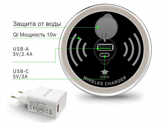 В столы серии Energy от Mealux интегрирована современная беспроводная зарядка Wireless Changer. Если ваш смартфон имеет встроенные приемники индукционных волн, вам нужно всего лишь приложить телефон (или планшет) на панель и зарядка активируется автоматически. Мощность беспрводной зарядки 10 w. Если же нет такой функции у девайсов – не расстраивайтесь! Под защитной водонепроницаемой накладкой находится два разъема – USB А (USB 5V 2.4А) и Type C (USB-C 5V 3A) для подключения к зарядке.