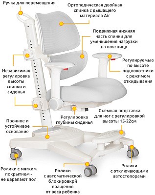 Ортопедическая спинка из дышащего материала Air разделена на две части. Движимая нижняя часть плотно прилегает к спине ребенка, повторяя изгиб позвоночника, поддерживает поясницу и обеспечивает еще больший комфорт во время занятий.