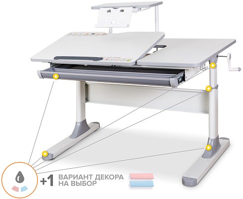 Подвижная часть столешницы меняет свой угол наклона с помощью специального газлифта. Одно плавное нажатие и вы трансформируете рабочую зону для письма и чтения, а благодаря большому углу наклона (до 60 градусов) столешницу можно использовать для рисования, как мольберт. Чтобы ребенок не травмировался, когда самостоятельно будет менять угол наклона, на столешнице есть безопасный зазор.