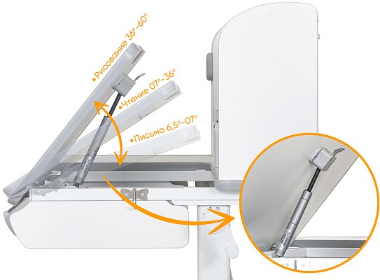 Подвижная часть столешницы меняет свой угол наклона с помощью специального газлифта. Одно плавное нажатие и вы трансформируете рабочую зону для письма и чтения, а благодаря большому углу наклона (до 60 градусов) столешницу можно использовать для рисования, как мольберт. Чтобы ребенок не травмировался, когда самостоятельно будет менять угол наклона, на столешнице есть безопасный зазор.