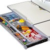 Под столешницей размещается большой и прочный органайзер для хранения школьных принадлежностей. В большое отделение ребенок может класть тетради, альбом для рисования, а в маленькое – мелкую и крупную канцелярию: ручки, карандаши, краски для рисования и многое другое.