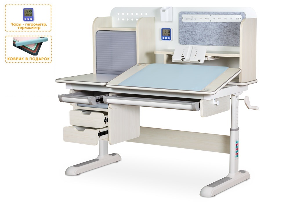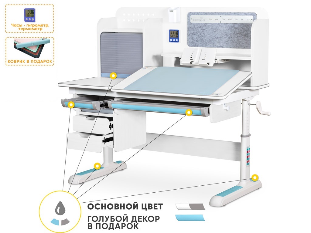 Высота стола регулируется с помощью червячного механизма ручкой, которую можно установить слева или справа на боковой части стола. Регулировка высоты Mealux Winnipeg в соответствии с ростом ребенка обеспечивает комфортную работу за столом и формирование правильной осанки